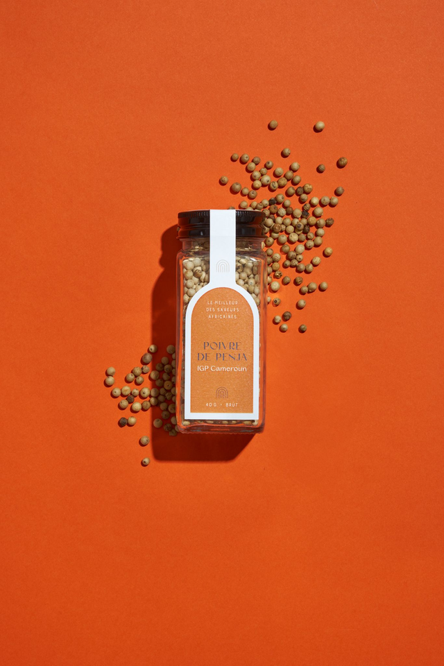 Graines de poivre de Penja du Cameroun. Considéré comme l’un des meilleurs du monde, il est obtenu à partir de baie de poivrier blanc. Il a obtenu une IGP (Indication Géographique Protégée) en 2013. Broyé sur du foie gras, ou dans une sauce au poivre, ce poivre sublimera tous vos plats.